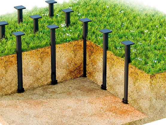 Диаметр свай обычно составляет от 89 до 152 мм, а длина – от 1200 до 3000 мм в зависимости от нагрузки и типа грунта.